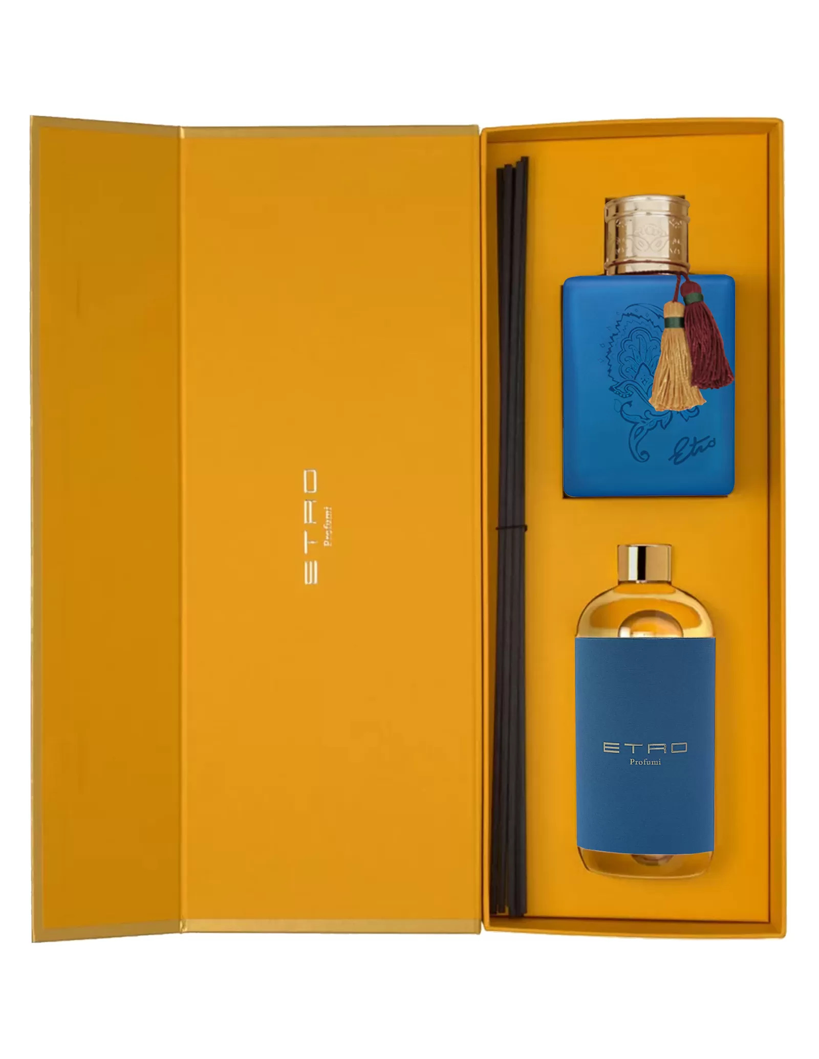 Etro'nun ikonik amblemi ile süslenmiş güzel renkli bir cam şişeye yerleştirilmiş Zefiro difüzör.
